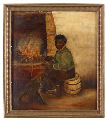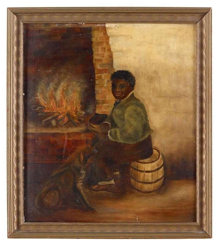 American School 19th/20th century portrait of a young boy and his dog fireside