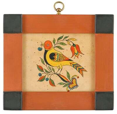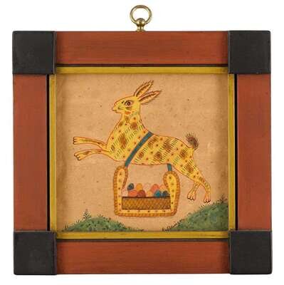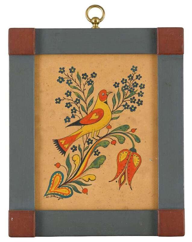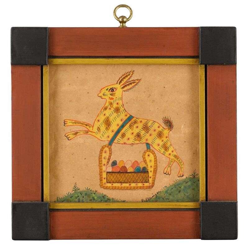 Including Easter Bunny, bird on a heart tree, and large bird on a heart tree, each signed, "D. Ellinger," watercolor on paper, painted frames.