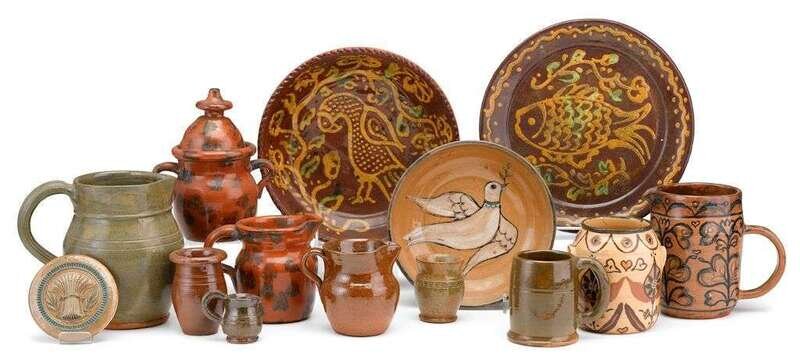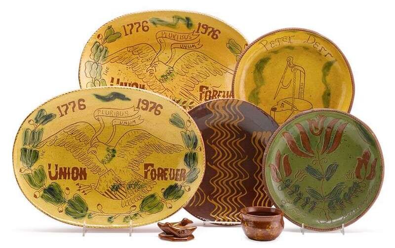 Including seven pieces of Stahl redware pottery: a pitcher, butter print with sheaf of wheat, miniature pitcher, two small jars, and a mug, each with inscription to underside; a shallow bowl with dove, and a floral-decorated twin-handled jar and pitcher, all by left-handed potter Russell Henry, Hay Creek, the shallow bowl inscribed, "I cast my vote for HHH who will win? Left handed Rusell Henry"; a spottedware covered jar and pitcher, both signed "JCS"; two Foltz Pottery plates, decorated with bird and fish, respectively; a small redware pitcher by Ben Owen; and seven pieces of Breininger redware pottery, including three variously decorated plates, two "Union Forever" platters, a small bowl, and two birds standing on shaped base.