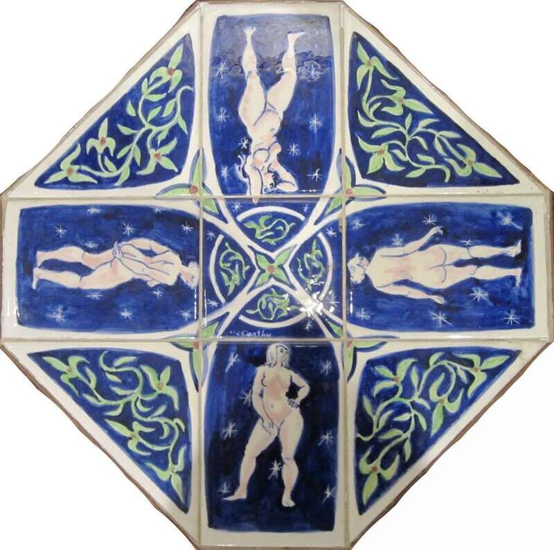 Signed, "McCarthy," the octagonal table top comprised of glazed tiles painted with nude females and scrolling foliage, raised on brass columnar support stemming from circular pedestal base.