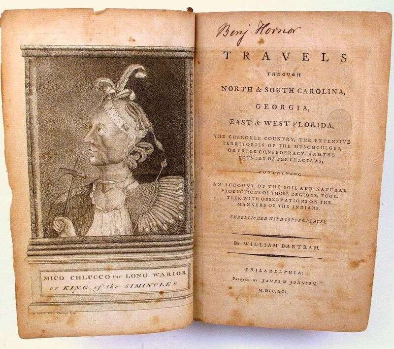 Bartram, William. Travels Through North & South Carolina, East & West Florida,... Philadelphia: James & Johnson, 1791. 1st ed. 8vo, contemp sheep, morocco spine label; rubbed & worn, covers detached, spine & label often rubbed away. With frontis, fold map & 7 plates (1 fold). Scattered light foxing, light to moderate toning & offsetting, occasional staining in margins.