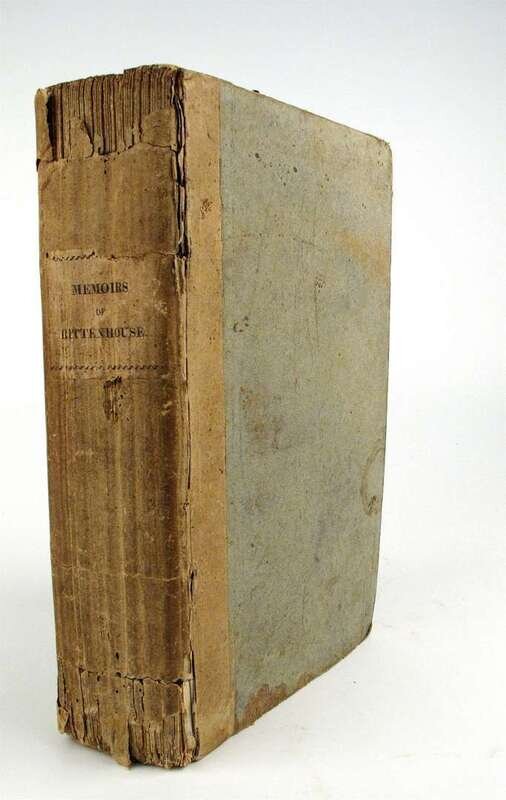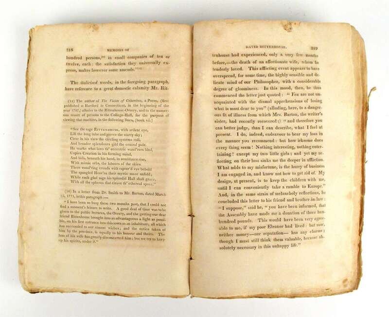 Barton, William. Memoirs of the Life of David Rittenhouse ... Philadelphia: Edward Parker, 1813. 8vo, orig bds, paper spine label; edges of bds rubbed, head & foot of spine chipped away, label scuffed, right ornamental border chipped away. Scattered light to occasionally moderate foxing, a few leaves partially browned from old clippings. Portrait, fold facs. Untrimmed.