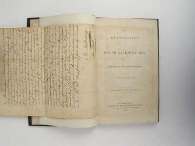 (Galloway, Joseph.) The Examination of Joseph Galloway, Esq. by a Committee of the House of Commons. Philadelphia: for the Seventy-Six Society, 1855. 1/250. 8vo, contemp 1/2 green morocco & marbled bds; joints & edges often rubbed. With ms copy of extract from the diary of Christopher Marshall on 2 leaves at back, presumably executed ca 1855. With ms document signed, Jos. Galloway, Philadelphia, Jan 23, 1766; 1p, 4to, linen-backed, tipped in facing title - some offsetting on title. Some foxing to endpapers, otherwise internally generaly clean. With the bookplates of Henry Penington, et al.