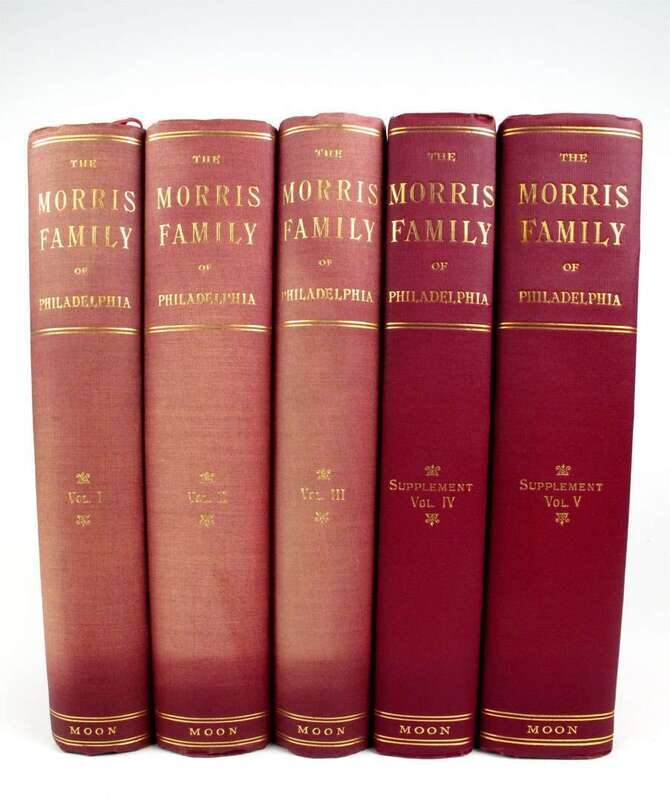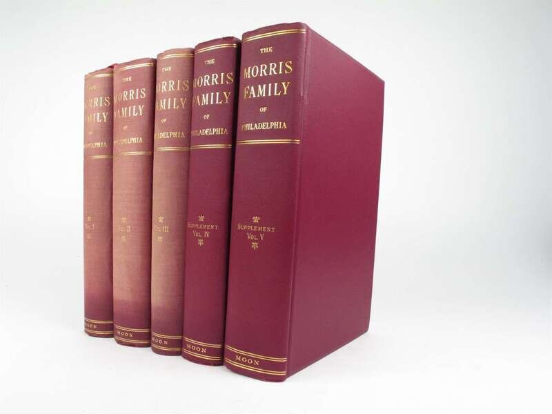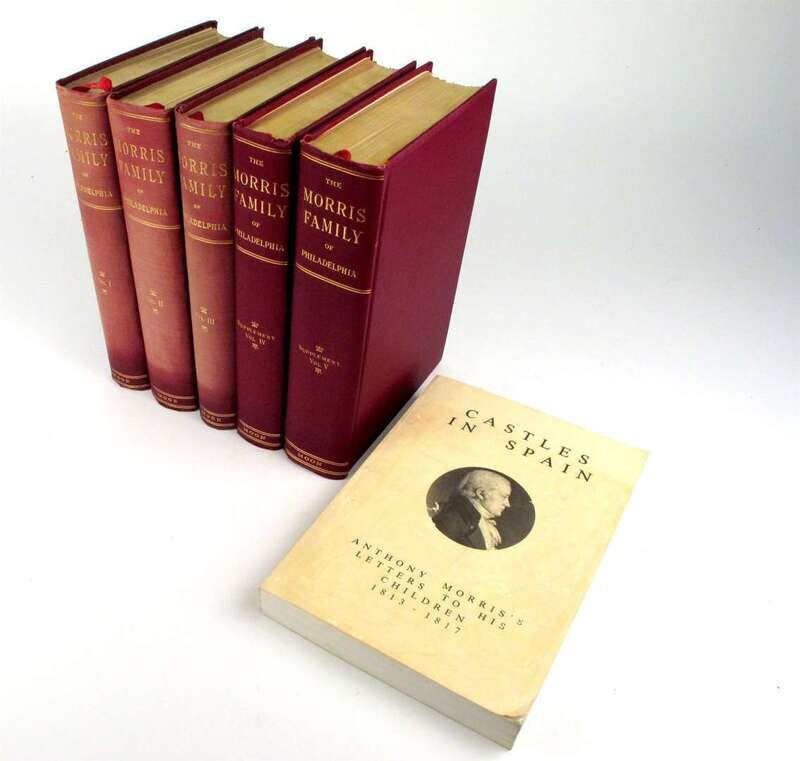 Morris Family History: Moon, Robert C. The Morris Family of Philadelphia, Descendants of Anthony Morris. Philadelphia, 1898-1909. Vols 1-5. Lg 8vo, orig maroon cloth, spines gilt, t.e.g., other edges untrimmed; minor wear, a few spines slightly sunned. Plates. * Castles in Spain. Anthony Morris' Letters to His Children 1813 - 1817. [Philadelphia]: Wyck Assoc., [1982]. 8vo, orig wrappers.