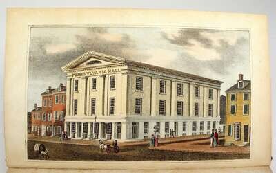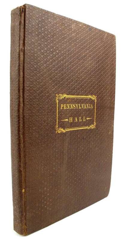 (Webb, Samuel, ed.) History of Pennsylvania Hall Which Was Destroyed by a Mob on the 17th of May, 1838. Philadelphia: Merrihew & Gunn, 1838. 8vo, orig gilt-lettered & stamped brown cloth; corners & spine ends frayed, occasional light wear to edges & joints. With color lithographic frontis + 2 plain plates. Light foxing, cresent-shaped dampstain at bottom center of all leaves & plates up to 2 inches above bottom edge. With errata slip, ptd 12mo 10-leaf Philadelphia High Sherrif's Report, Oct 20, 1838 mtd at back spine edge to front blank. Presentation copy to J.L. Pierce, M.D., "presented by the managers and stockholders of the Pennsylvania Hall Association to ... " on front free endpaper. With bookplates of J.L. Pierce, et al on front paste-down.