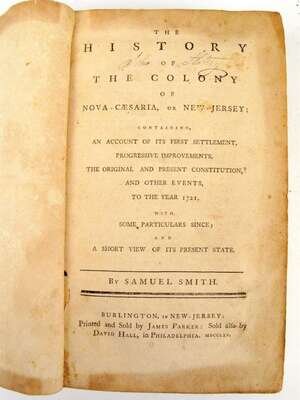 (Franklin, Benjamin, Press of.) Smith, Samuel. The History of the Colony of Nova-Caesaria, or New Jersey. Burlington: James Parker, also sold by David Hall, 1765. 8vo, contemp paneled sheep, morocco spine label; spine & extremities rubbed, covers detached but present, label chipped. Scattered light foxing, minor staining to back matter, edges & gutters. Complete with terminal blank. Contemp ownership signature at foot of errata.