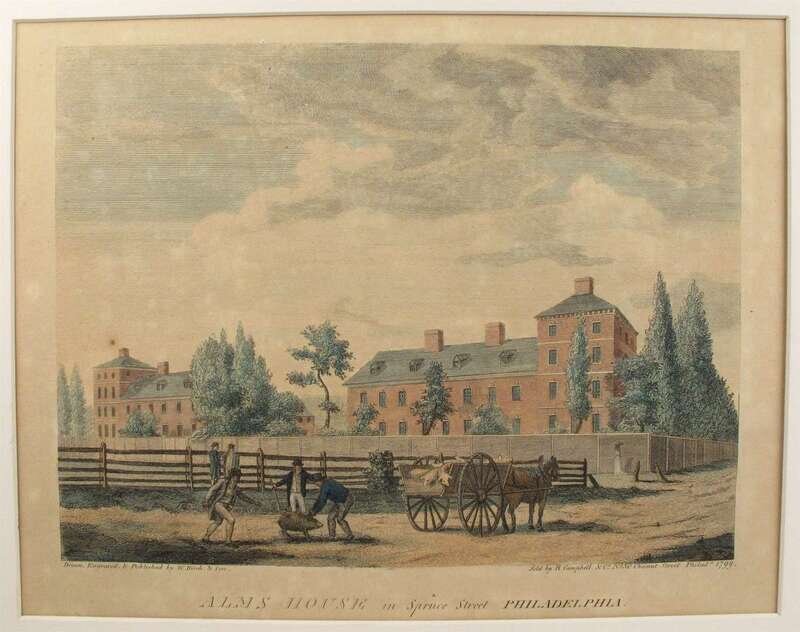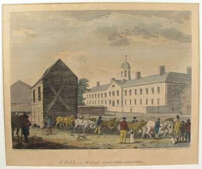 (Birch's Philadelphia Views.) Hand-Colored Engravings. Birch, W[illiam]: " Goal, in Walnut Street, Philadelphia." Philadelphia, 1799. 1st ed. 10 1/2 x 12 7/8 in; 267 x 327 mm. Trimmed just within or just at plate mark. Moderately toned throughout, moderate mat burn. Snyder 24. * "Alms House in Spruce Street, Philadelphia." Philadelphia, 1799. 1st ed. 11 x 12 7/8 in; 279 x 327 mm, full margins. Lightly to moderately toned throughout, light mat burn. S 25. Both with orig color.