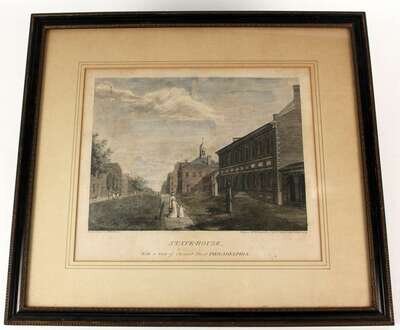 (Birch's Philadelphia Views.) Hand-Colored Engraving. Birch, W[illiam]. "State House, with a View of Chestnut Street Philadelphia." [Philadelphia]: R. Campbell, 1798. First ed. 13 1/8 x 11 1/8 in; 333 x 282 mm, narrow margins. Repaired tear at bottom left extending 1/2 inch into image, light scattered foxing, mtd on bd. Orig color. Framed.