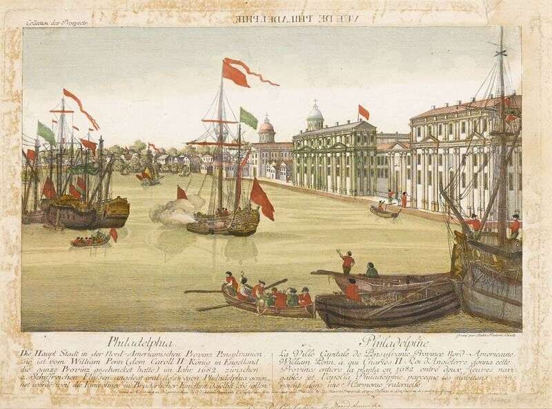 (Vue d'optique.) Hand-Colored Engraving. Leizelt, Bath F. "Vue du port de Philadelphie." Augsburg, ca 1776. 1st state. 12 1/4 x 16 3/4 in; 310 x 425 mm, narrow margins. Glue mtd on verso of margins & edges of plate (to about 1 inch inside plate mark), correspondingly discolored on recto. Image generally clean, slightly wrinkled.