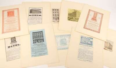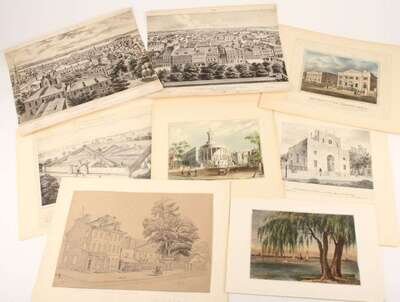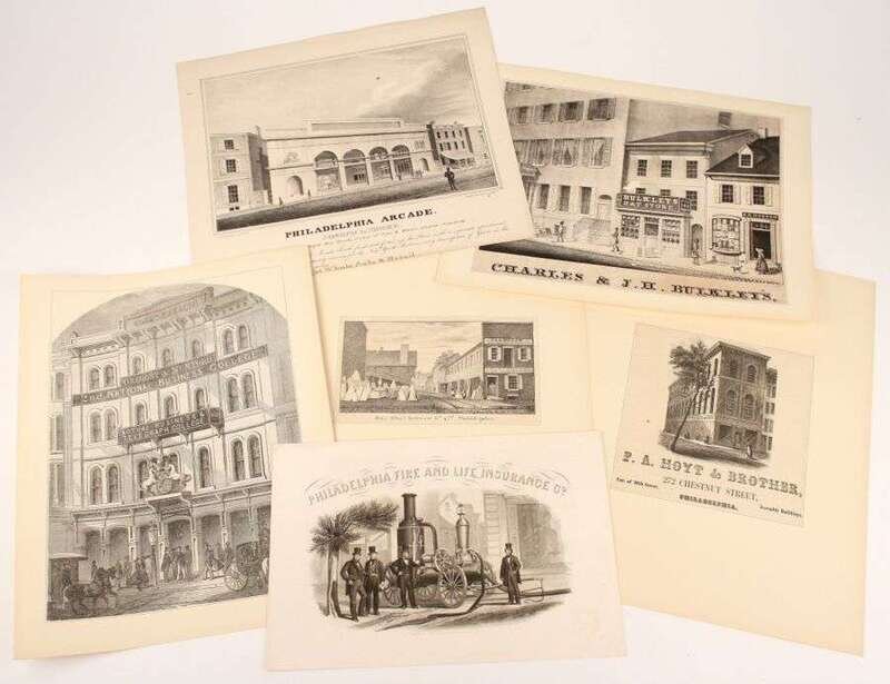 Engraved & Lithographic Views - Philadelphia & Environs - Ca 1800-1900: Several folio sheets, but most 4to & smaller, many window mtd. Includes uncolored & restrike Birch views, Wild panoramas (4), Baxter panoramas. Architectural, commercial, industrial & other images. Approx 150 pieces - 2 watercolors, 8 hand-colored or tinted views.