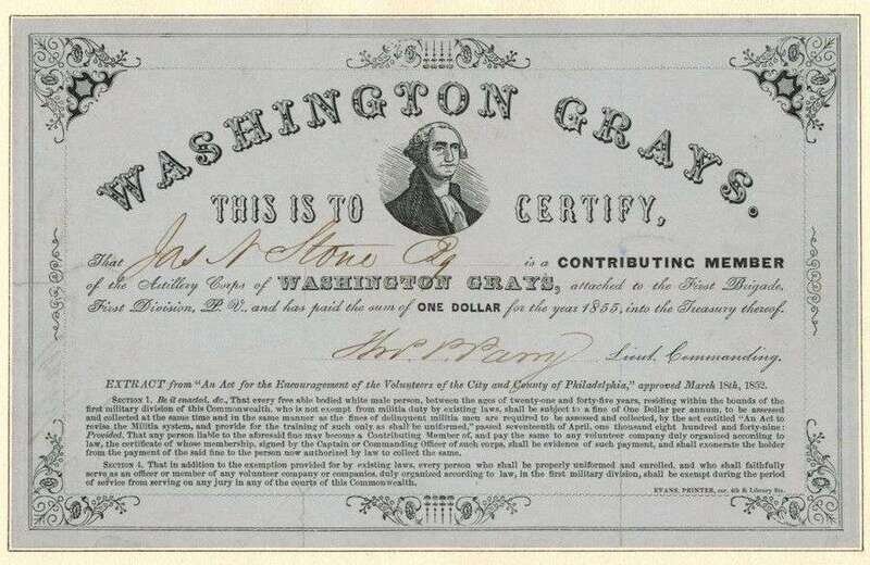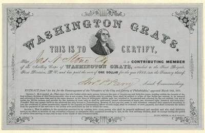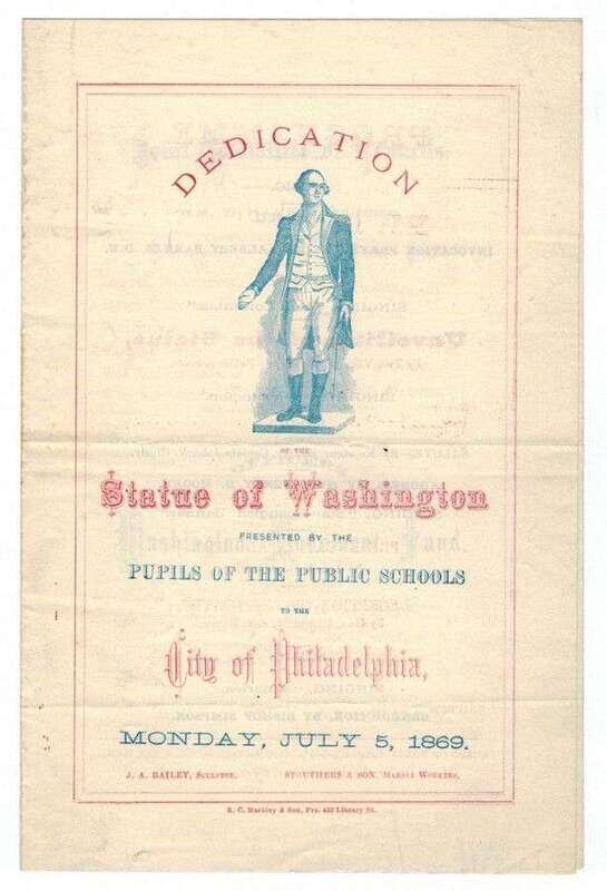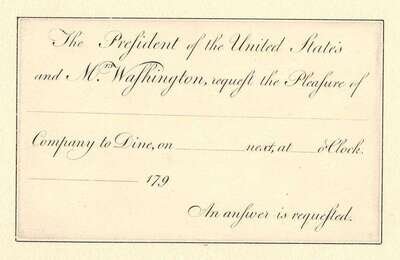 George Washington: Presidential Invitation to Dine. [Philadelphia, ca 1790s.] 2 7/8 x 4 7/8 in; 123 x 75 mm. Not filled in, clean & window mtd. * Printed Document. Washington Grays membership, 1855. Window mtd. * Program, ptd in red & blue. Dedication of the Statue of Washington. Philadelphia, July 5, 1869. * Lot also includes early 19th-century small format engraved portraits of G. Washington. Clean.
