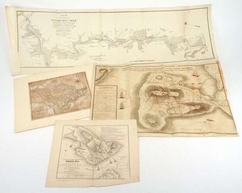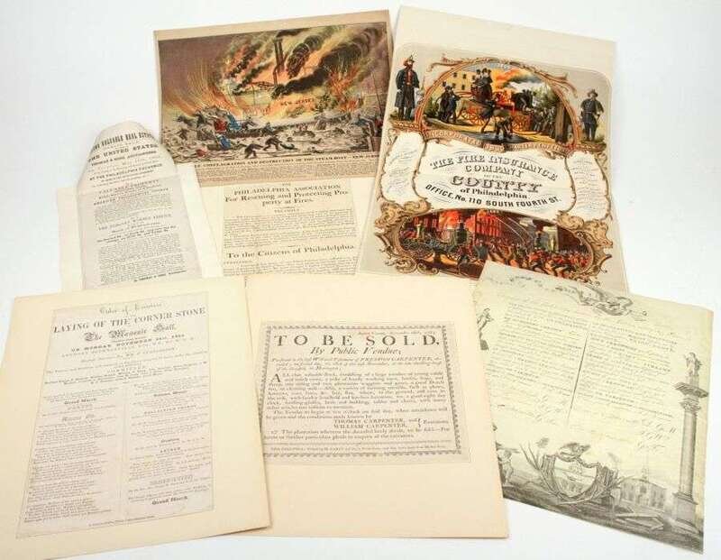 Philadelphia Broadsides &C - Ca 1785-1870. Subjects include public auction (Preston Carpenter estate, ptd by M. Carey), firefighting, Masonry, watchman's address. Lot also includes 1868 fold map of the Wissahickon in Philadelphia. Folio sheets & smaller, several window mtd.