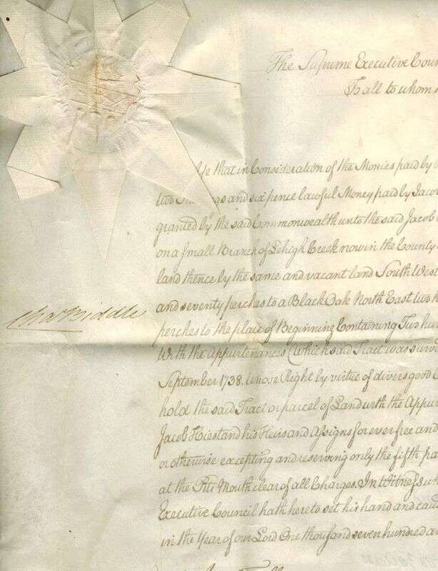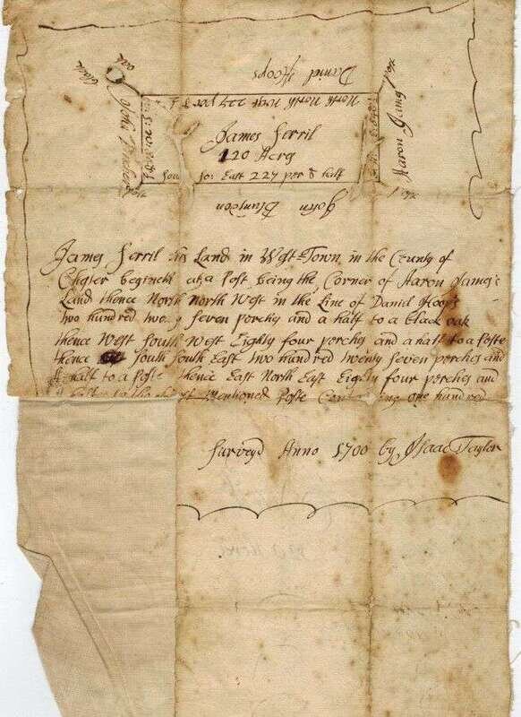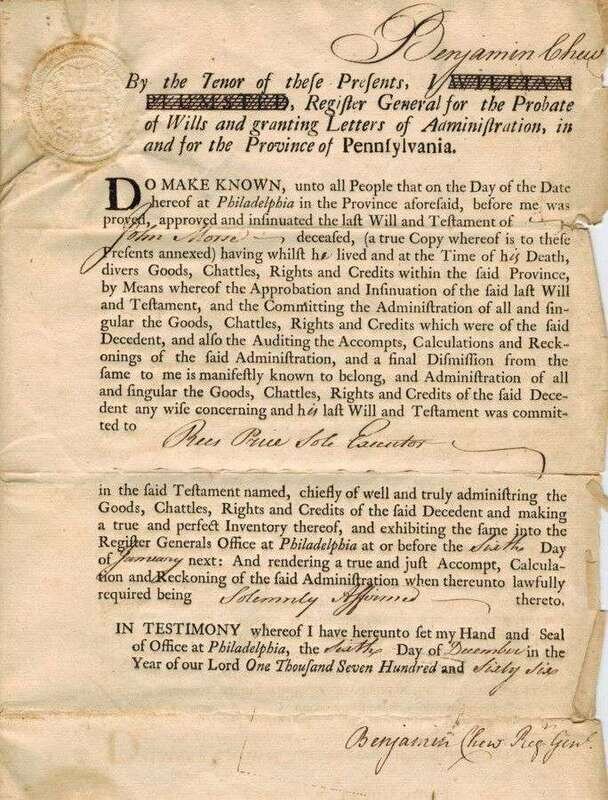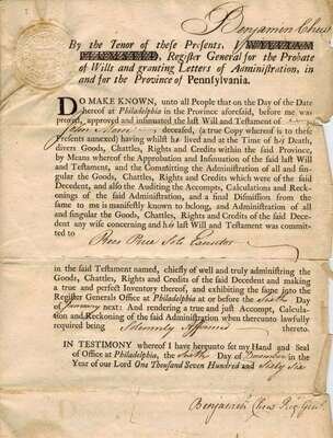 Manuscript Material - 18th-Century Manuscript & Partly Printed Documents Relating to Philadelphia & Environs. Includes land patent signed by Charles Biddle; probate documetns signed by Benjamin Chew; Westown ms map, 1700. Approx 12 pieces.