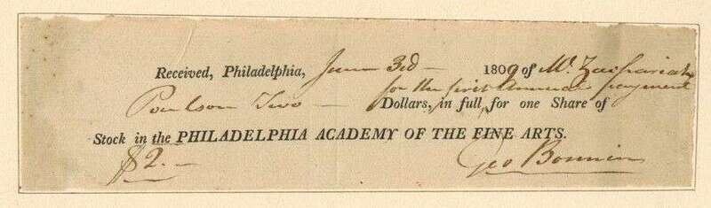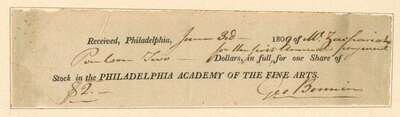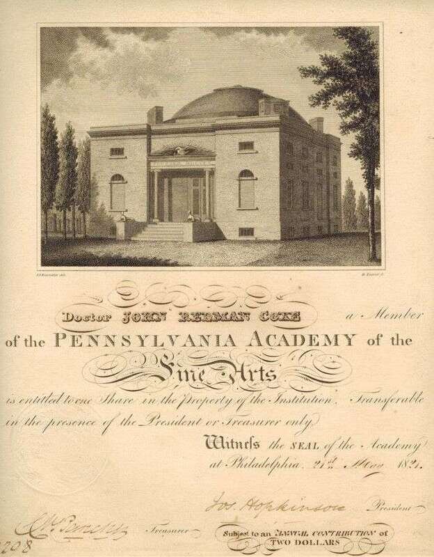 Pennsylvania Academy of Fine Arts: "A Catalogue" - caption title. [Philadelphia, 1814.] Sm 4to, orig blue wrappers, (3)-32pp. Moderate foxing, minor repairs, ink title on front wrapper, uncut. * Partly Printed Document Signed. Hopkinson, Jos. Philadelphia, May 21, 1821. 4to sheet with vignette. PAFA membership for John Redman Coxe. Window mtd. Clean & attractive.