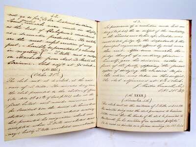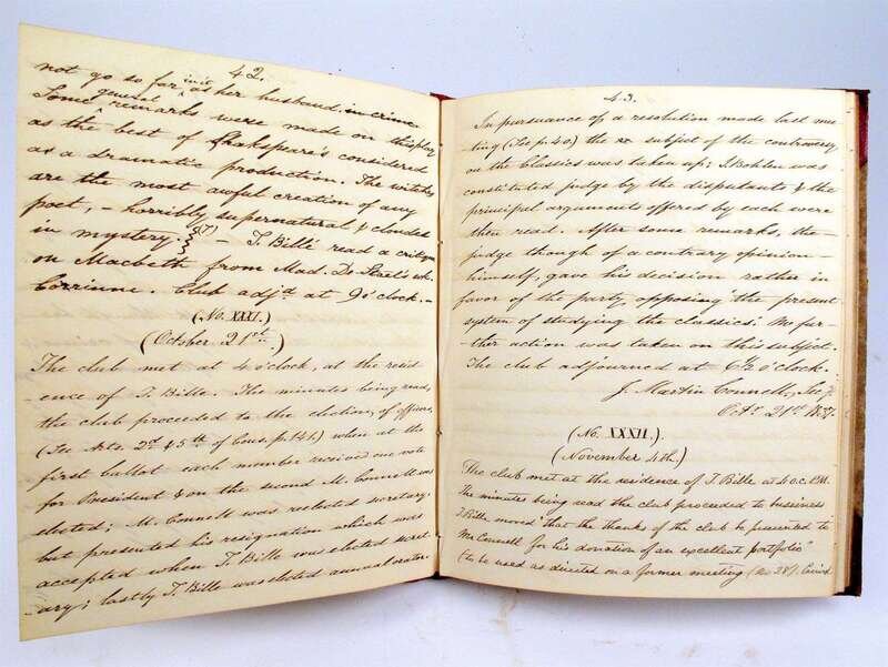 Manuscript Minutes Book. "The Proceedings of the Literary and Scientific Club of Philadelphia, Instituted April 12th, 1836." [Philadelphia, ca Apr 16, 1836-1840.] 4to, orig 1/4 morocco & bds; extremitites rubbed, slightly dusty. Approx 86pp. Includes ms "History & Constitution of the Club." Internally clean.
