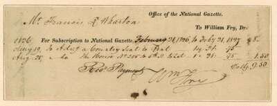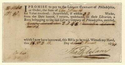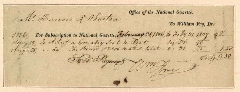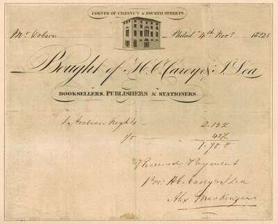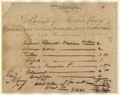 Partly Printed Documents - Literary Philadelphia in the 18th & 19th Century: Library Company of Philadelphia, return receipt, Nov, 1784. * LCP, yearly dues, May 2, 1809. * Carey, Mathew. Invoices with ptd letterheads, ca 1805 & Nov 4, 1825; the first signed on verso, "M Carey." * Philadelphia periodical subscriptions: The Tickler, 1809; The Aurora, 1811; National Gazette, 1827; Country Democratic Press, 1828. All documents filled in in ms, window mtd. Lot also includes small format Sartain mezzotint portrait of Mathew Carey.