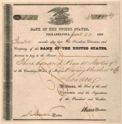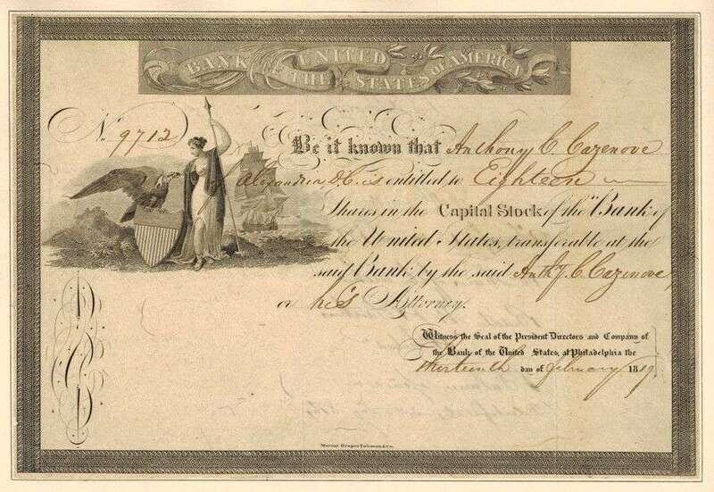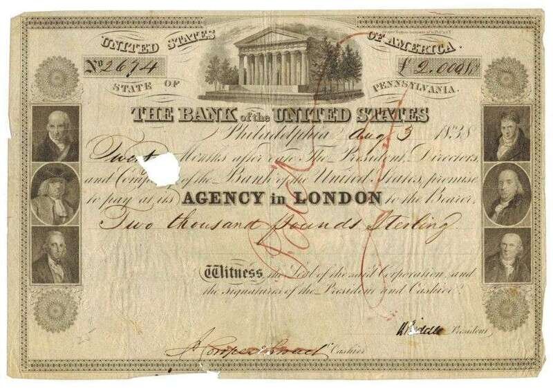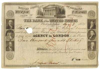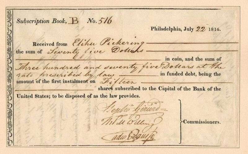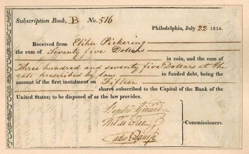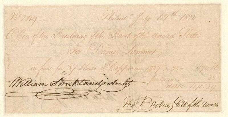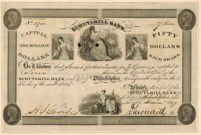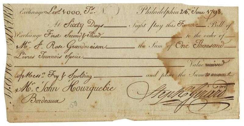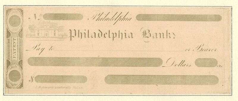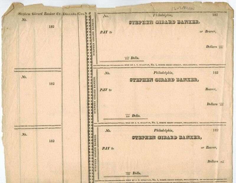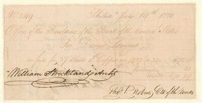 Philadelphia Financial Documents - Late 18th & Early 19th Century - Includes Bank of the United States Checks & Shares, Stephen Girard & Schuylkill Bank Documents: Signatures include William Strickland, endorsement on verso of Bank of the United States check; Stephen Girard, on Bill of Exchange, June 25, 1798. Many window mtd. 11 pieces.