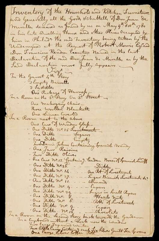 Juan de Miralles, Spain's first consular agent to the U.S., rented from 1777 to 1780 the Spruce St. townhouse that had been home to John Penn, Pennsylvania's last colonial governor. Miralles furnished his residence in the highest style and served as host for many lavish entertainments attended variously by Philadelphia's elite, congressional leaders, as well as by General George Washington and many of his senior officers. Miralles, who was to have been named Spain's first ambassador, died of "pulmonic fever" in April, 1780 while visiting General G. Washington at his Morristown, NJ headquarters. His executors, congressman Robert Morris and Francisco Rendon (his secretary & successor), ordered a complete inventory of the diplomat's furnishings & personal possesions, room by room for the Spruce St. house & his farm at Mount Pleasant. The unpublished ms above contains the complete inventory of both residences.