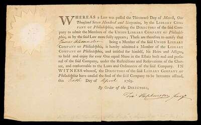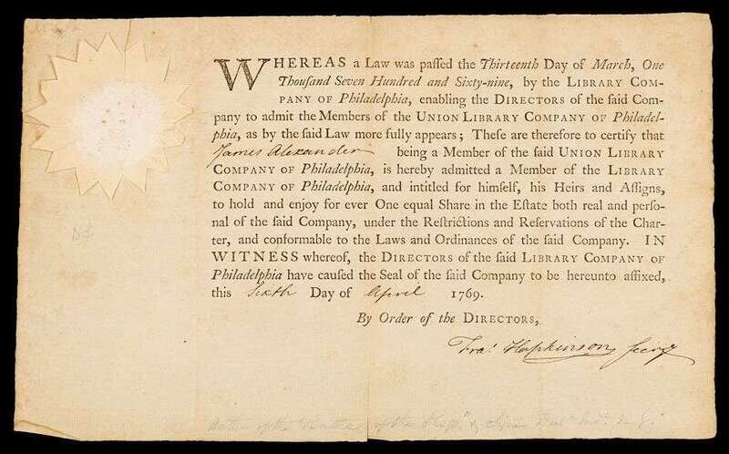 Document Signed. Hopkinson, Francis. Philadelphia, Apr 6, 1769. Sm oblong folio; slightly dusty, light creases along old folds. Paper seal. Admitting James Alexander, member of the Union Library Company, to The Library Company. Mostly ptd, filled in in ms.