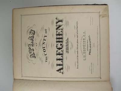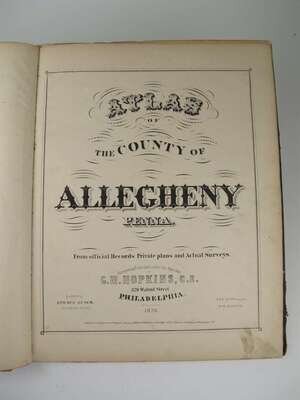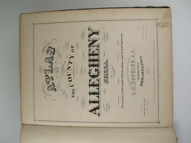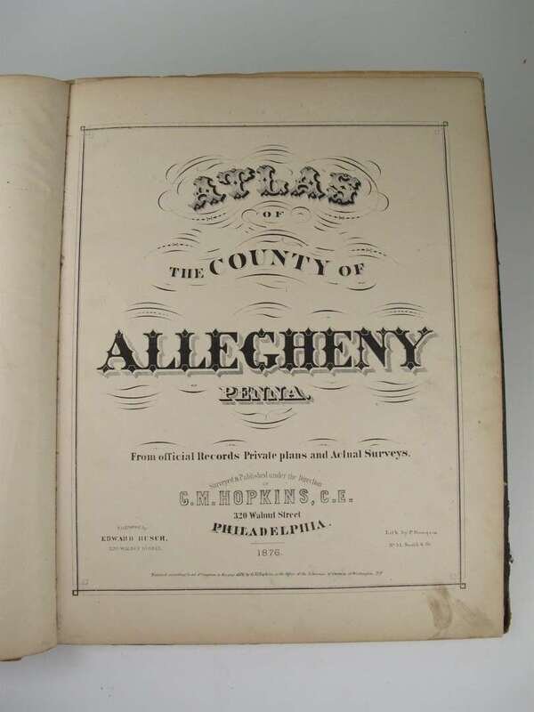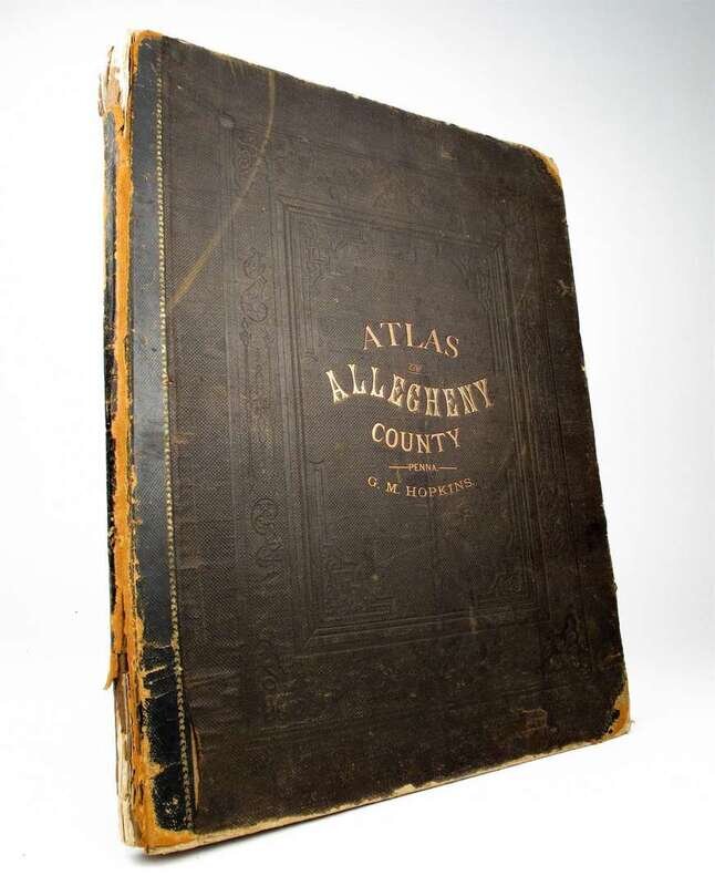 (County Atlas.) (Hopkins, G.M., pub.) Atlas of the County of Allegheny. Philadelphia, 1876. Folio, orig gilt-lettered morocco-backed cloth; rubbed, spine & corners defective. With 60 color plates, double-page U.S. map detached but present. Scattered minor internal wear.