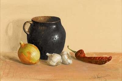WILLIAM ACHEFF (AMERICAN B. 1954) TABLETOP STILL LIFE WITH VESSEL, ONION, GARLIC AND HOT CHILE