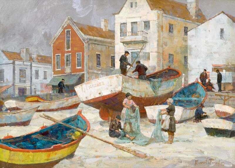 KENNETH RILEY (AMERICAN B. 1919) "MENDING NETS NAZARE"
