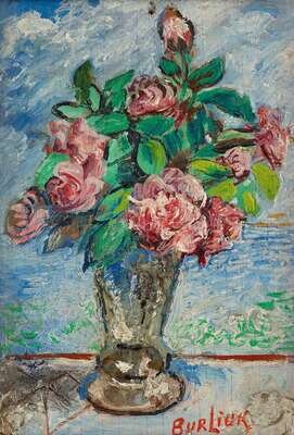 DAVID DAVIDOVICH BURLIUK (AMERICAN/UKRAINIAN 1882-1967) STILL LIFE OVER LOOKING THE SEA