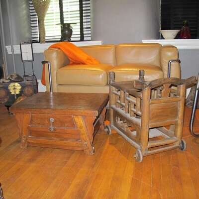 Chinese child's cart and two storage chests late 19th / early 20th century