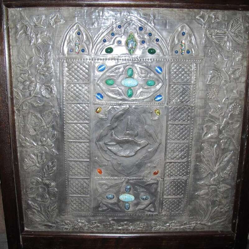 The square wood frame enclosing a tin panel repousse worked to show an arched structure with trefoil and arabesque designs, accented with art glass cabochons, the central arabesque with a sparrow, the arched structure surrounded by a trail of flowers and butterflies against a brick ground, the top rail of the screen bearing a metal plaque of a fish, the backside unfinished.