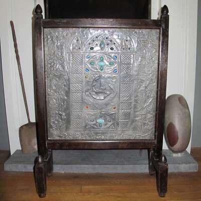 English aesthetic movement hammered tin and art glass fire screen circa 1880