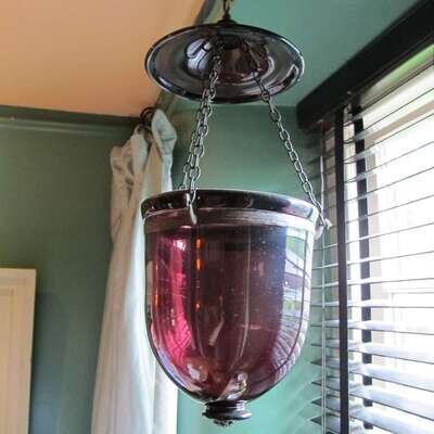 Smoke bell above bell-shaped lantern with knob finial, supported by birld-cast hooks and chains.