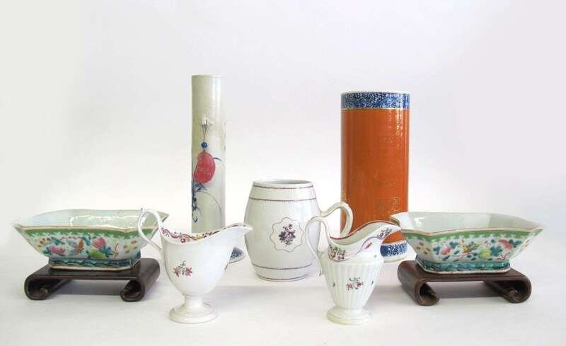 Including a pair of octagonal bowls with polychrome enamel of fruit and butterflies, two cylindrical vases, tankard, and two creamers. (7).