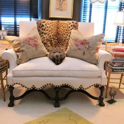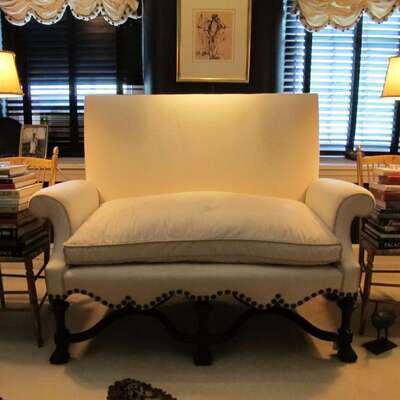 The rectangular stuff-over back with scroll arms above stuff-over cushion seat and shaped apron, supported on saucer-turned legs joined by U-shaped stretchers and hoof fore-feet.