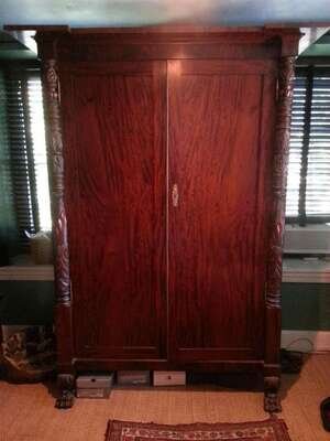 The architectural cornice over twin paneled doors flanked by acanthus and basket weave carved half columns and paneled sides, the doors opening to a series of drawers, supported on acanthus and paw carved feet.