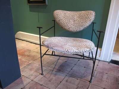The painted iron frame with faux leopard printed animal hide upholstered seat and back, original leather straps for arm rest not present.