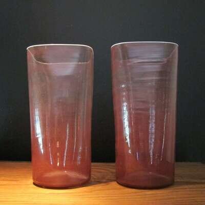 The tapering square form vases in clear glass with applied white rim over a spiral of ruby latticino decoration to body, sticker label Vetri/Murano, engraved signature to underside barovier toso murano.