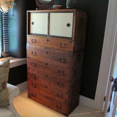 The rectangular top over twin sliding doors with shagreen pattern embossed paper fronts opening to a series of drawers and shelves above a long single drawer, the lower section with five long drawers, the sides of the case mounted with bronze handles.