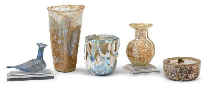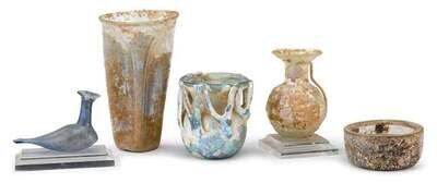 Including bird-shaped bottle, pinched cup, thread-decorated vase, molded vessel and low bowl.