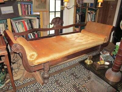 The back with arched and carved crest centered by pinwheel cartouche above caned seat supported on baluster turned and reeded feet.