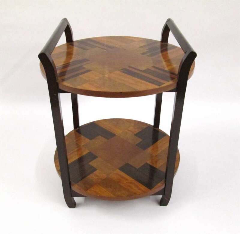 The twin circular tiers with mixed wood parquetry inlay in the cubist manner, joined by twin full-length handles.