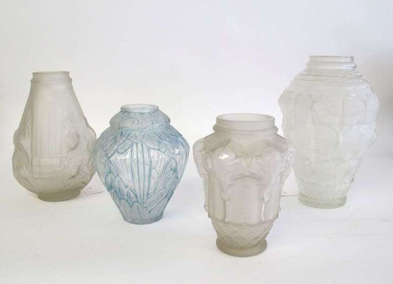 Edmond Etling, four molded and frosted glass vases france, circa 1930