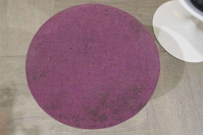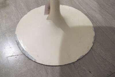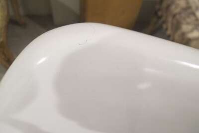 Painted fiberglass, cast metal, upholstery, Made in France label to underside of one chair, knoll international labels to underside of seats and stool.