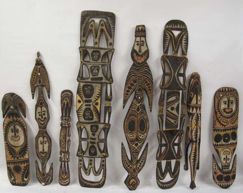 Collection of eight carved and painted boards papa new guinea