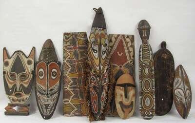Collection of nine masks, shields, and boards papa new guinea