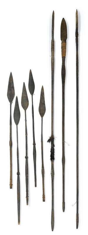 Collection of eight carved wood and steel tipped spears