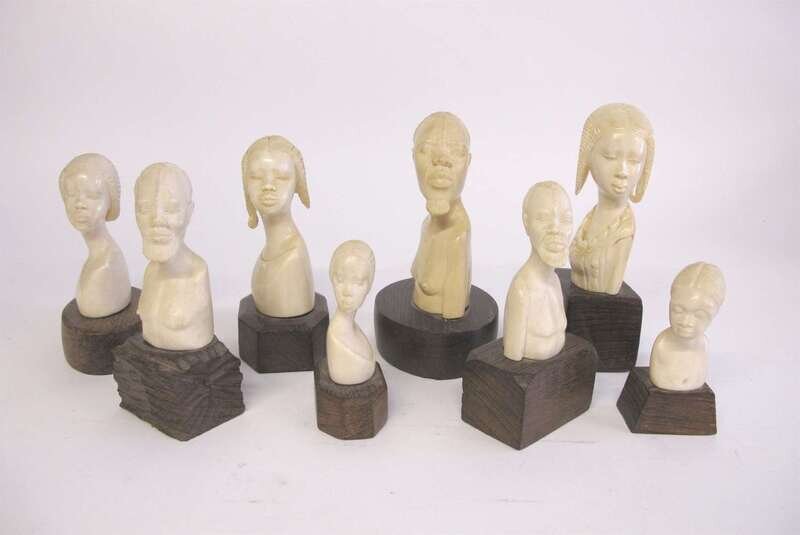 Eight carved African ivory busts on wood stands one signed nzinga and another signed ?mitim