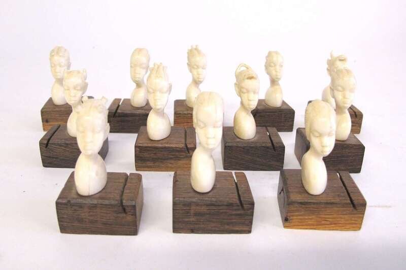 Twelve small African ivory busts mounted on place card holders all signed dombele