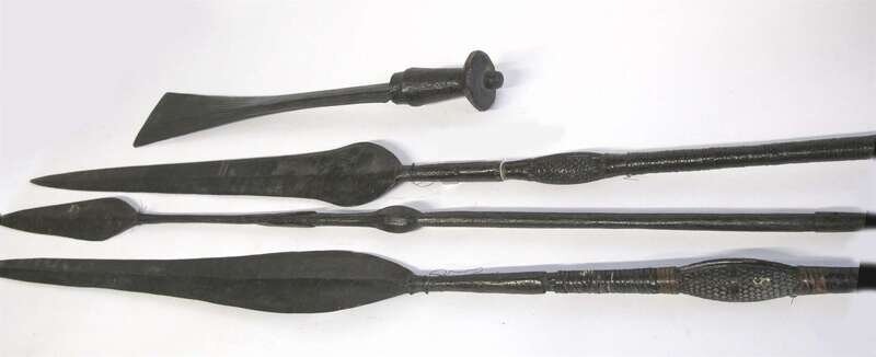 Group of three African elephant spears and a panga probably 20th century
