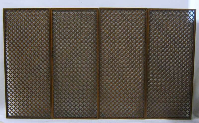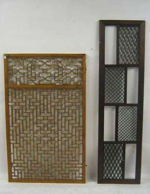 Four panels carved throughout with diamond lattice, together with two individual panels and two rolled bamboo shades.