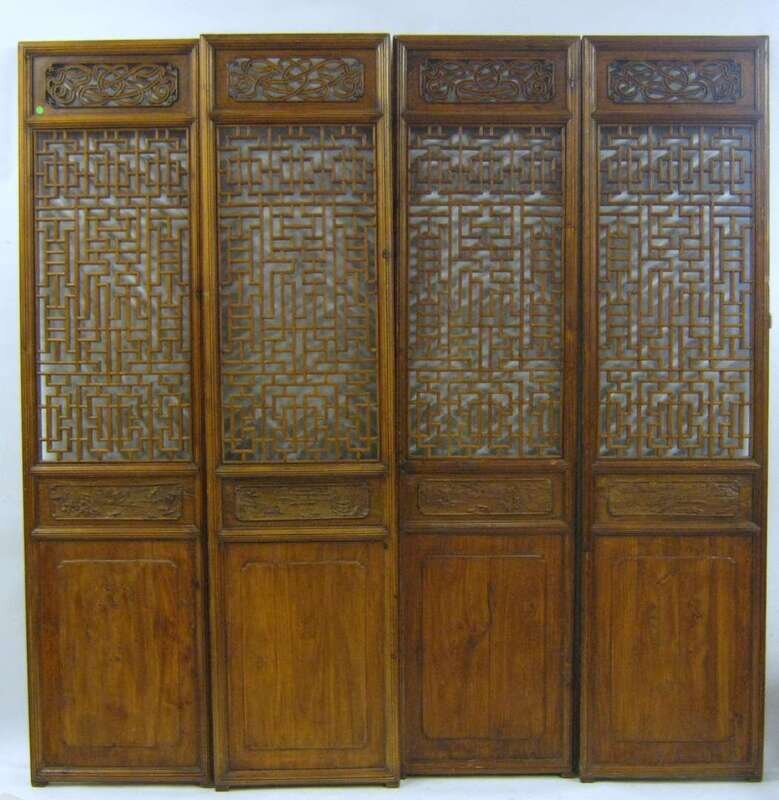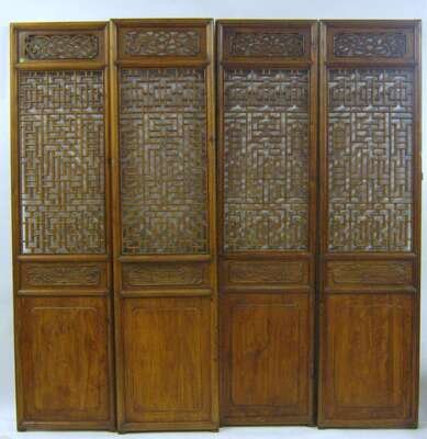 Each fold divided into four sections, a large lattice panel and a solid panel seperated by narrow stylized cartouch panels.